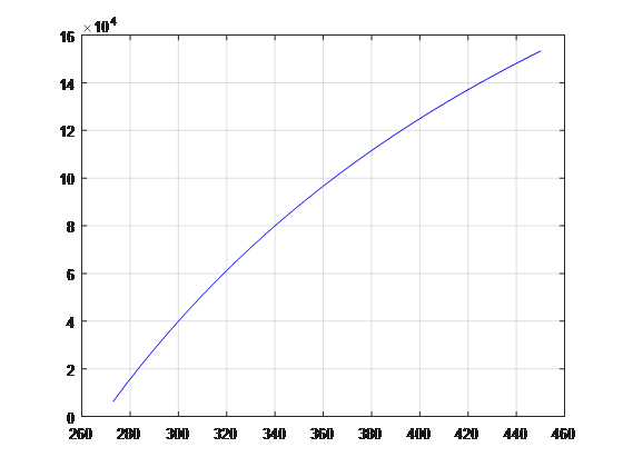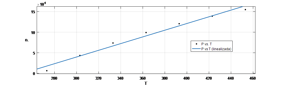 La ecuación de la recta está dada por: \(P(T)=813.3T-\ 2.043x{10}^5\) (A partir de \(f(x)\ =\ p1\ast x\ -\ p2\))