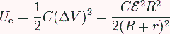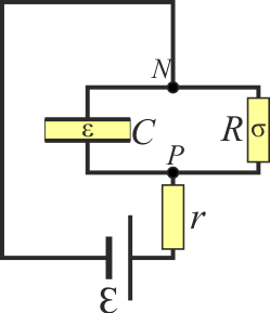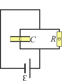 Ahora llevaremos el circuito a su versión equivalente. Este elemento es tanto un capacitor C (caracterizado por una carga y una energía almacenada) como una resistencia R (caracterizada por una corriente y una potencia disipada por efecto Joule). La diferencia de potencial entre los extremos de la resistencia es la misma que entre los del condensador, por lo que ambos elementos están en paralelo.