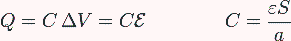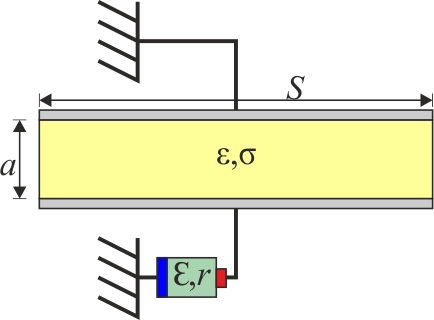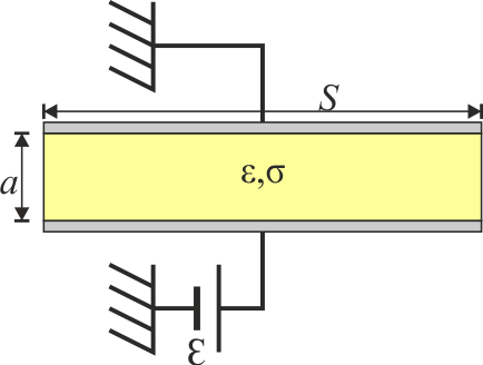 El modelo con el que se identifica el capacitor (de una forma general, independiente de su dieléctrico, es aquel en el que se tienen dos placas perfectamente conductoras de sección S, separadas una distancia a entre las cuales hay un dieléctrico de permitividad \(\varepsilon\) y con una pequeña conductividad \(\sigma\). Entre las placas se establece una d.d.p. constante por medio de una fuente de f.e.m \(\epsilon\), tal y como se ilustra en la figura a continuación: